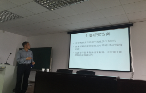 他从石墨烯复合材料对重金属离子和放射性核素的吸附研究发展历程出发,向我们分享了他的科研成果和科研历程,讲述了他目前主要研究方向:1、放射性核素在环境中的化学行为研究;2、纳米材料功能化修饰及对环境目标污染物治理;3、等离子体技术制备纳米材料,并应用于能源和环境领域研究。详细介绍了U(Ⅵ)在氧化石墨烯上的吸附核解析行为的实验与第一性原理研究。王祥科教授的学术报告内容详实,现场气氛非常的活跃。