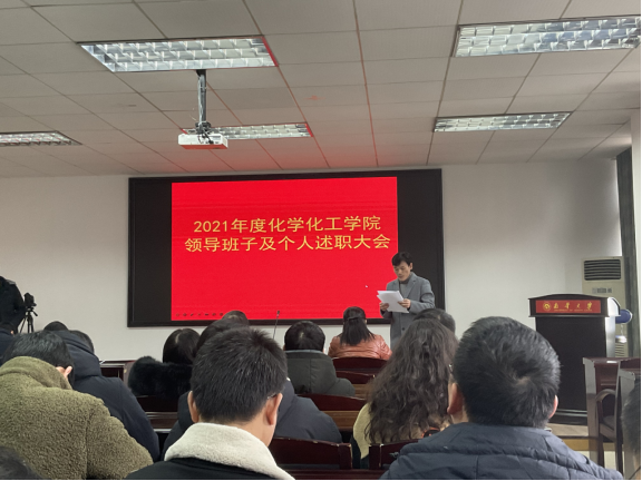 根据公司党委统一部署,化学化工公司于221日下午在化工楼学术报告厅举行2021年度领导班子及个人述职大会。公司党委组织部汪波莅会指导,公司领导班子及全院教职员工参加会议,会议由公司党委书记王宏青主持。