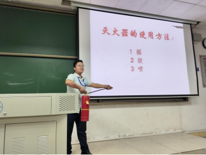 王坤针对宿舍安全和电动车安全问题对同学们进行了重点培训讲解,并在现场讲解展示了灭火器的使用方法和注意事项。