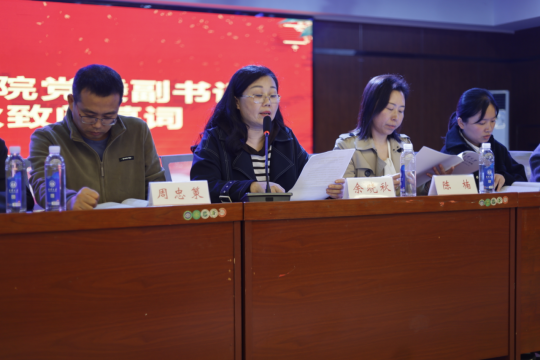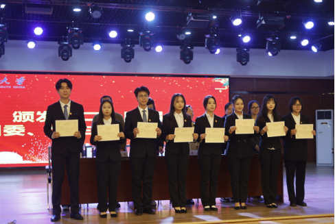 公司党委副书记余晓秋、院学工室主任陈楠、院学工室全体辅导员为新一届员工干部颁发聘书。