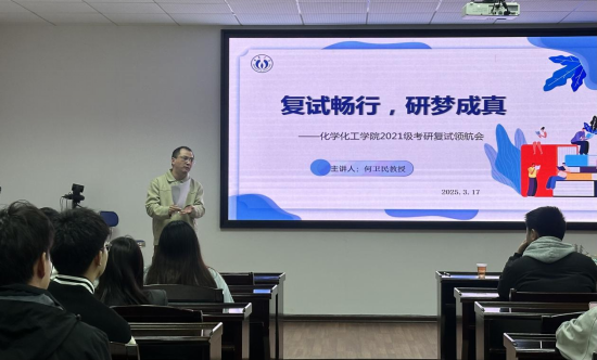 2025年3月17日,sunbet申搏在化工楼411会议室举办2021级复试考研领航会。会议邀请公司副经理何卫民教授现场授课。