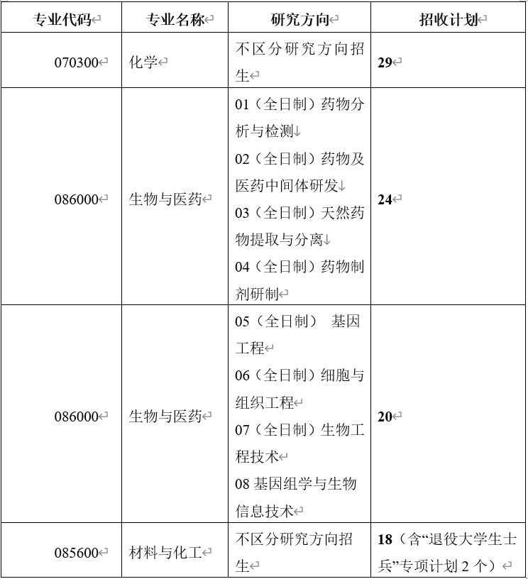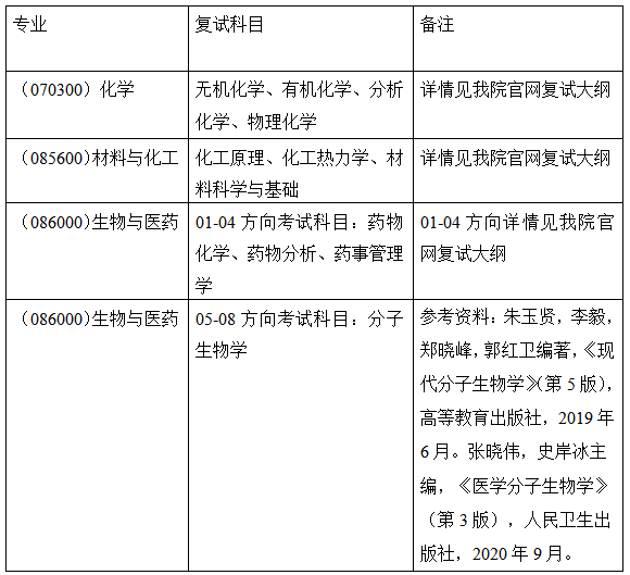 (2)材料与化工(0856)专业和生物与医药(0860)的接收跨学科门类调剂,其中材料与化工(0856)接收一志愿报考0703化学专业考生调剂,生物与医药(0860)(01药物分析与检测、02药物分析与检测、03药物分析与检测、04药物制剂研制)接收一志愿报考0703化学专业,0710生物学,1007药学(学术型),1055药学(专业型),1008 中药学考生调剂。