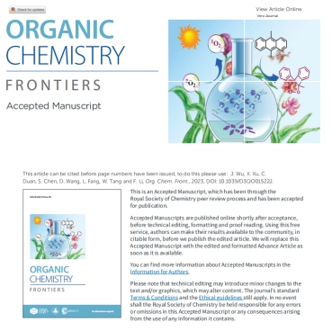 公司李富盛博士在光催化高炔丙醇的选择性合成研究中取得新成果,研究成果《Diastereoselective 1,2-difunctionalization of 1,3-enynes enabled by merging photoexcited Hantzsch ester with chromium catalysis》(DOI: 10.1039/D3QO01522J)在线发表在化学领域Top期刊《Organic Chemistry Frontiers》(中科院大小类均为1区)。其中公司20级制药工程专业吴佳同学为论文的第一作者,21级制药工程专业段崇文、陈姗、王丹、方立馗同学也参与了相关工作,李富盛博士为该论文的唯一通讯作者,sunbet申搏为该论文的唯一通讯单位。