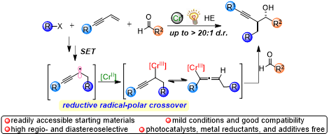 该工作利用可见光协同铬催化实现了1,3-烯炔的化学选择性和非对映选择性功能转化,不仅为低碳烯烃在多组分反应体系中的选择性功能转化提供了新的思路,而且也为在精细化学品和药物设计合成中具有重要价值的高炔丙醇的合成提供了新的方法。研究工作得到了sunbet申搏启动基金的支持与资助。