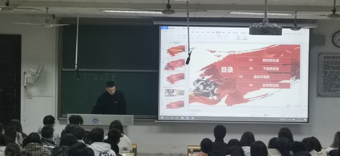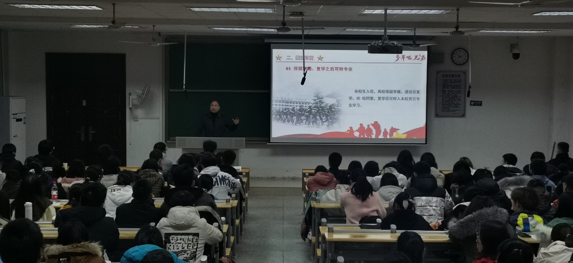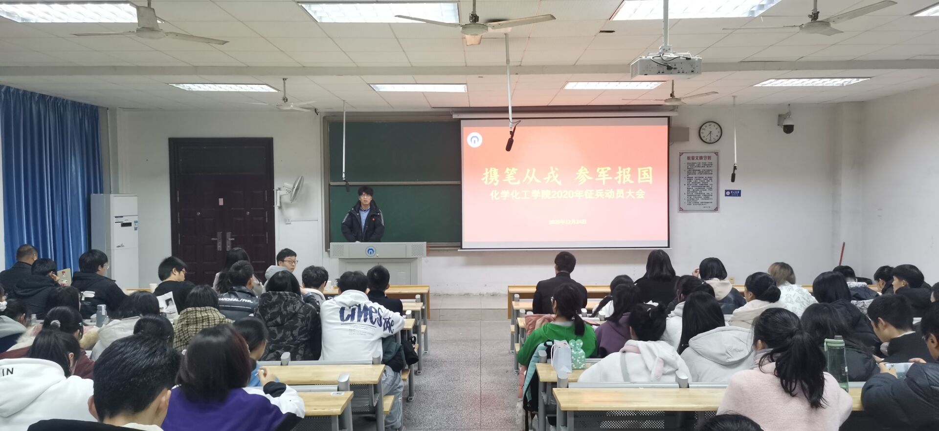 为认真做好本年度老员工征兵工作动员,多措并举引导员工响应国家号召,应征入伍,报效祖国,sunbet申搏于12月24号在化工楼301教室举办了“携笔从戎、参军报国”2020年征兵动员大会。学工室主任陈楠,辅导员颜晔、2020级新生参加大会。大会由颜晔主持,特邀校武装部汪先利、最美老员工优秀退伍士兵黄程宣讲。