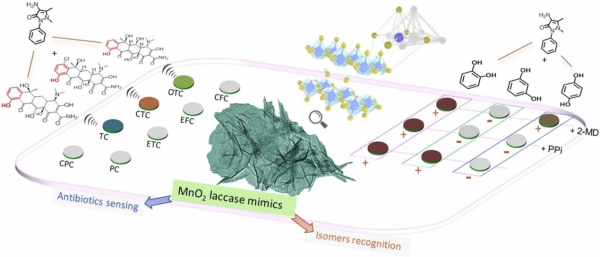 近日,sunbet申搏蛋白质结构与功能实验室林英武教授团队设计了一种金属锰氧化物超薄纳米膜,并通过“后刻蚀法”赋予了具有催化活性的金属中心和微环境。该纳米材料可以成功模拟天然漆酶,对底物(邻氨基酚)催化转化速率是天然漆酶的20倍。基于此,团队设计了一种简便的双功能比色平台,成功用于阵列检测化学物质二羟基苯异构体,以及水体和动物饲料中含酚基团的四环素类药物(见图例)。