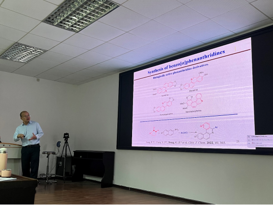本次报告中,邓教授简单介绍了环己酮在催化剂的作用下脱氢可以产生碳-碳双键,以及题组近年来以环己酮及其衍生物为底物的脱氢芳构化及其进一步转化反应的相关研究,实现了苯并噁唑、N-芳基磺酰胺、2-硫醚基苯酚、3-芳基吲哚、吩噻嗪类等化合物的合成,为一些具有生物、药物活性小分子的合成提供了环境友好的新途径。