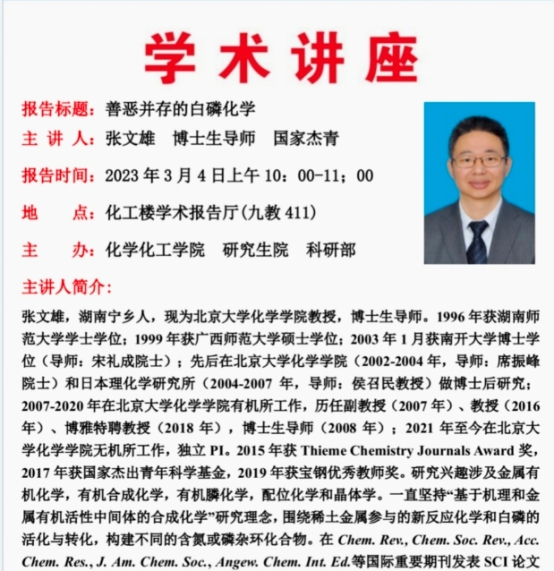 2023年3月4日上午10点,应sunbet申搏邀请,北京大学张文雄教授以《善恶并存的白磷化学》为题为公司师生进行了精彩的学术报告。公司经理林英武教授担任主持,公司相关领域的老师和员工参加了此次报告。
