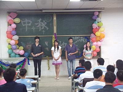 晚会以庆祝中秋佳节为主题,节目异彩纷呈,唱歌、舞蹈、观众互动游戏将现场气氛推向一个又一个高潮。新生的双截棍及书法表演,技艺精湛,展现了他们在艺术方面的才能。深情款款的合唱《花好月圆》勾起了观众的思乡之情。诗歌朗诵、舞蹈、《心有灵犀》《吹蜡烛》等互动小游戏共15个节目充分展示了大一新生的才艺。大二大三员工和教官们也登台表演或互动。此外,公司还专门为每位新生准备了月饼、饮料等。
