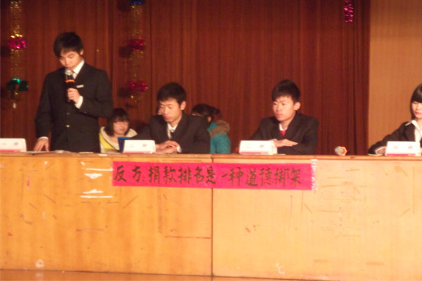 比赛过程中化工公司为反方,支持观点捐款排名是道德绑架。公司选手始终立场坚定,辩论选手思路清晰,逻辑严谨。赛场上双方反应敏捷,出语犀利,双方辩手各持己见,有攻有守,语气慷慨激昂,谈吐掷地有声,整个场上气氛热烈,高潮迭起,精彩纷呈。