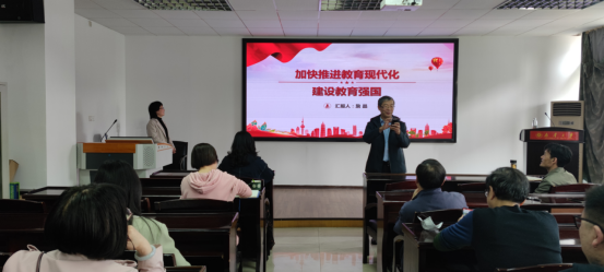 詹晶在会上作“加快推进教育现代化 建设教育强国”的主题报告,带领大家从学习党的二十大报告原文入手,通过报告讲授、数据呈现、现场互动等多种形式,认识到教育现代化是中国式现代化的重要组成,体会到党的二十大报告再次强调教育强国建设并提出新的更高要求,意义重大而深远。